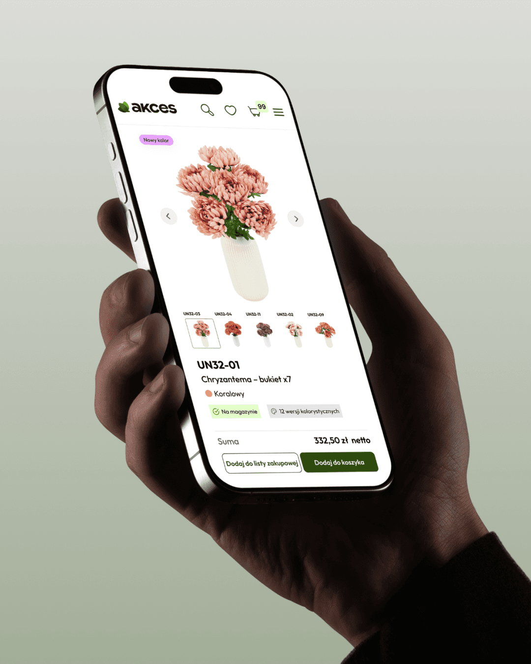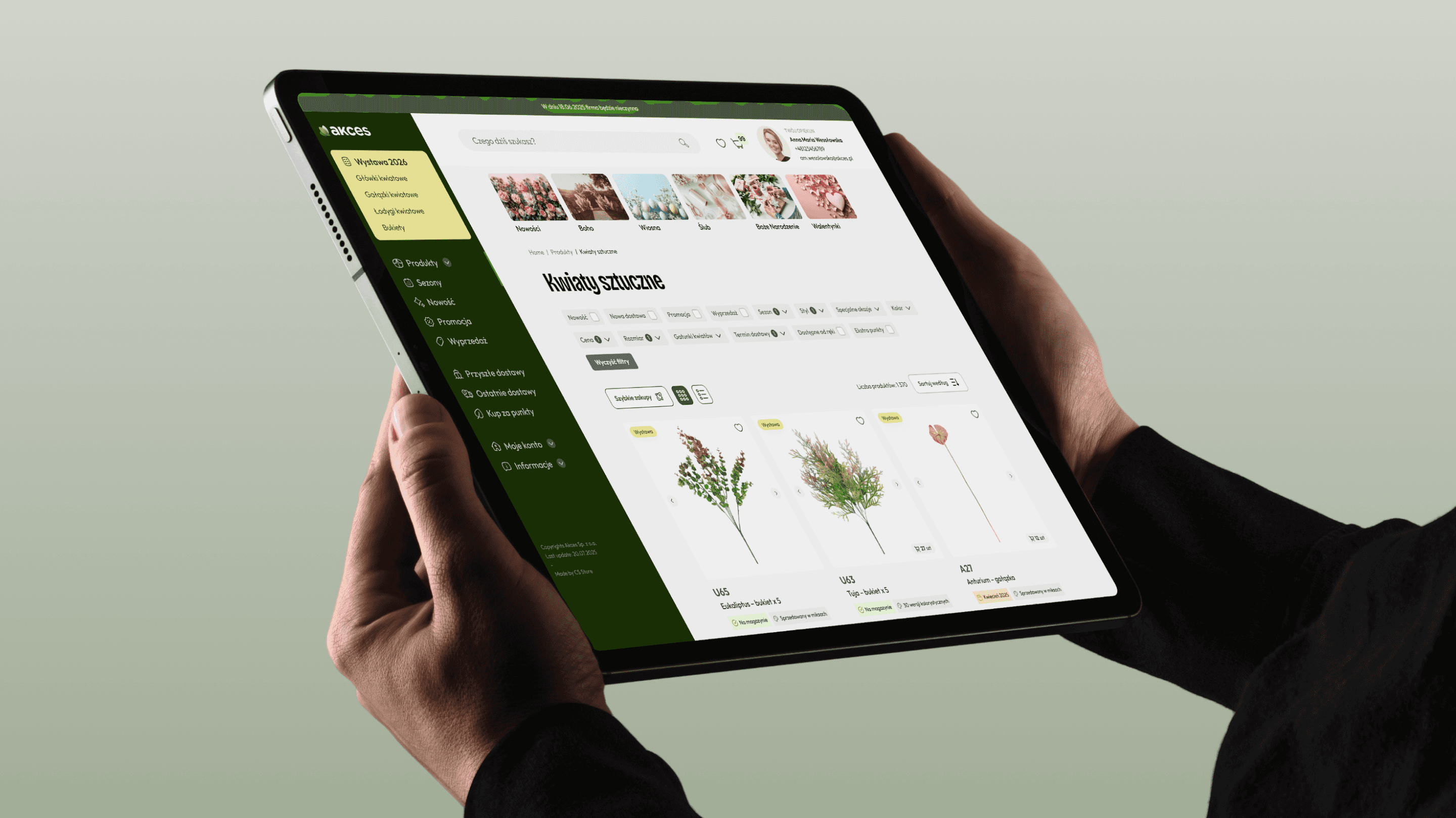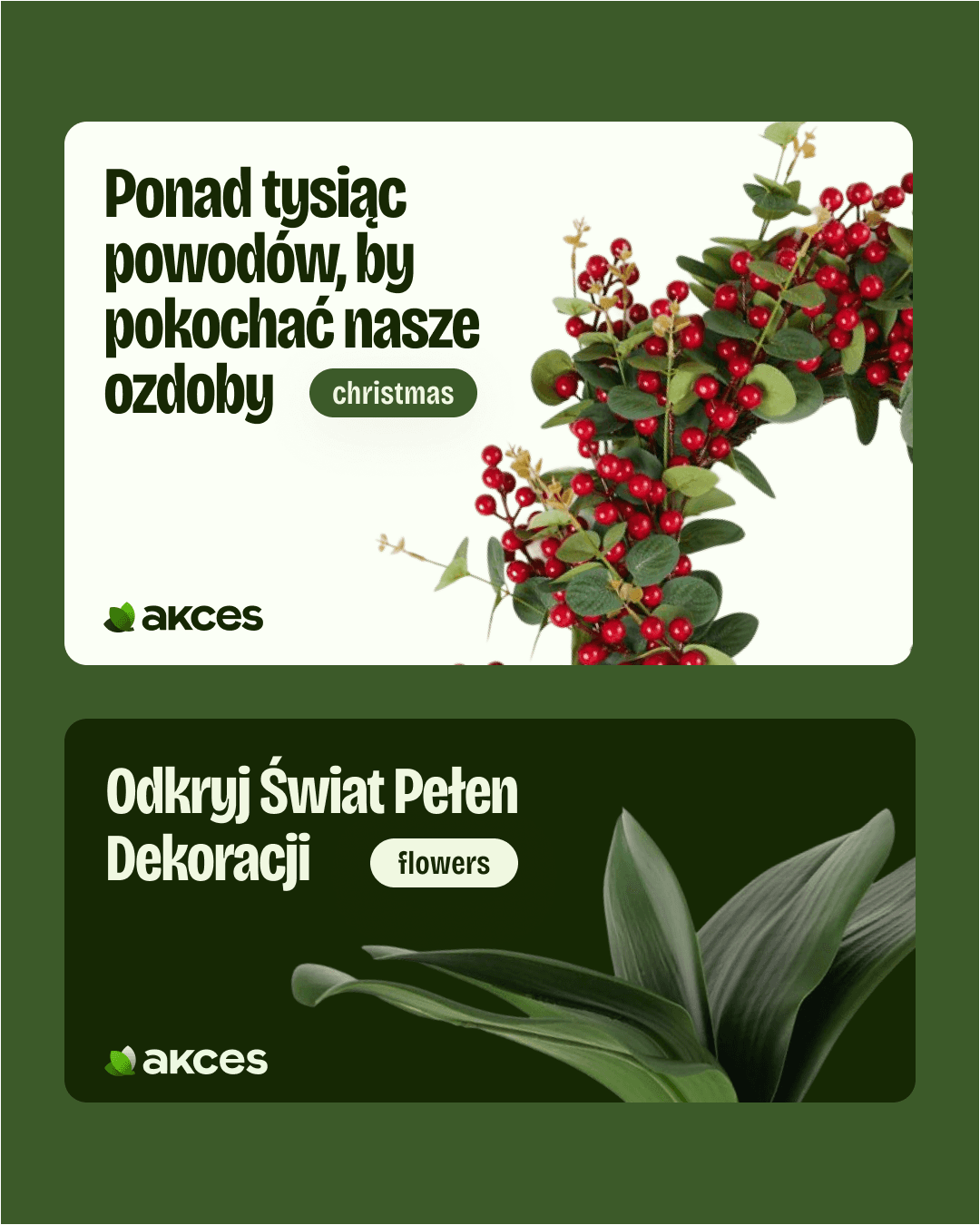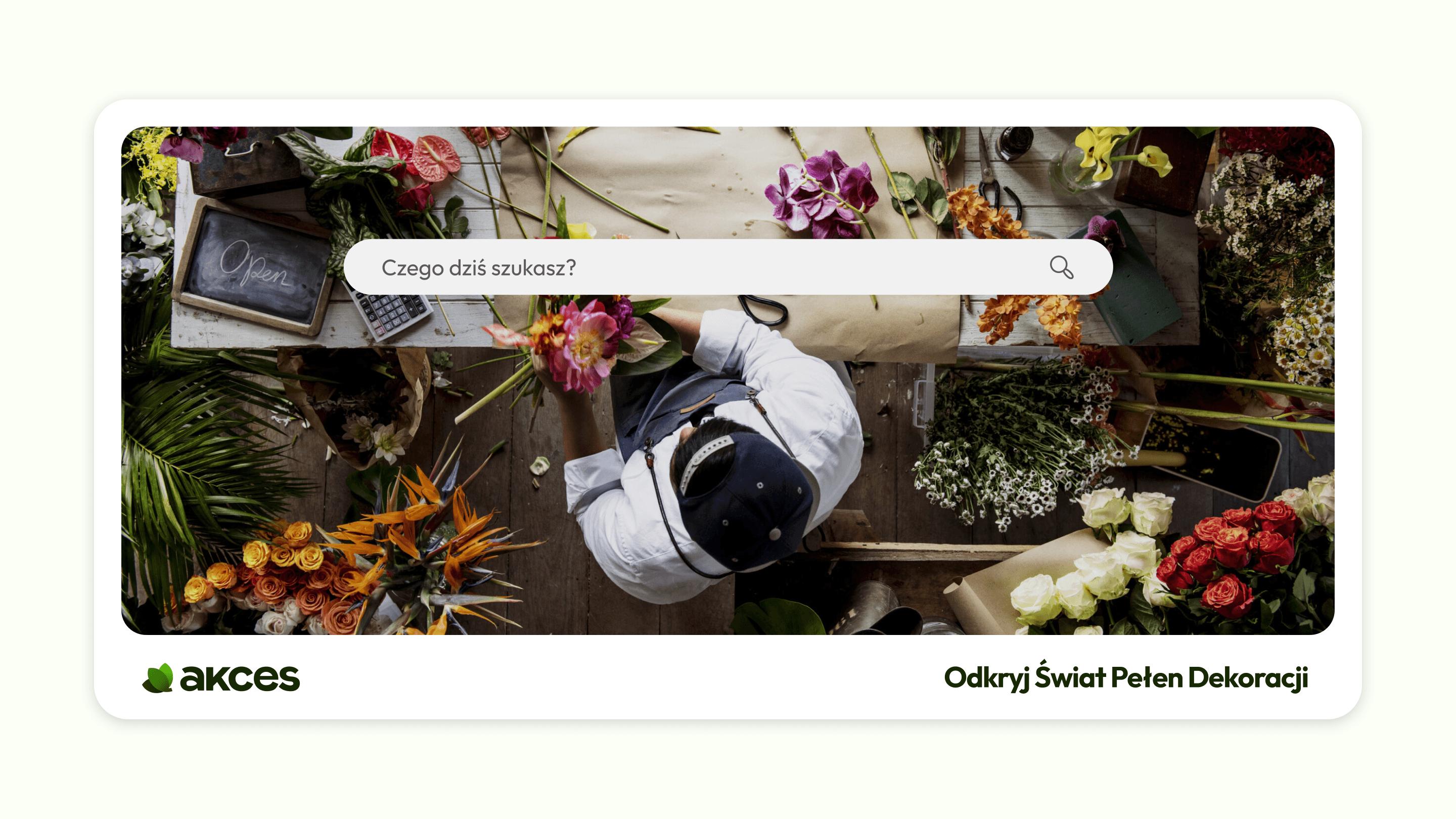 Zaczęliśmy od fundamentów. W ścisłej współpracy z właścicielami wypracowaliśmy nowe pozycjonowanie — Akces to już nie tylko hurtownia kwiatów, ale kreator świata dekoracji. Marka zyskała nową energię, współczesny język wizualny i spójne narzędzia komunikacji.